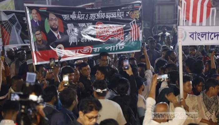 পুষ্পস্তবক অর্পণের পর জাতীয় পার্টির ব্যানার দেখে টোকাই এনসিপির নেতাকর্মীরা ‘ভুয়া ভুয়া’ স্লোগান দেয়া শুরু করে।