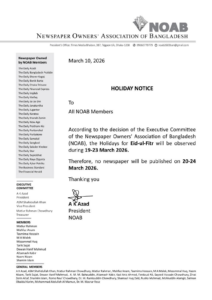 বিজ্ঞপ্তিতে বলা হয়েছে, নিউজপেপার ওনার্স অ্যাসোসিয়েশন অব বাংলাদেশ (নোয়াব)-এর নির্বাহী কমিটির সিদ্ধান্ত অনুযায়ী, ২০২৬ সালের ১৯-২৩ মার্চ ঈদুল ফিতরের ছুটি পালিত হবে।