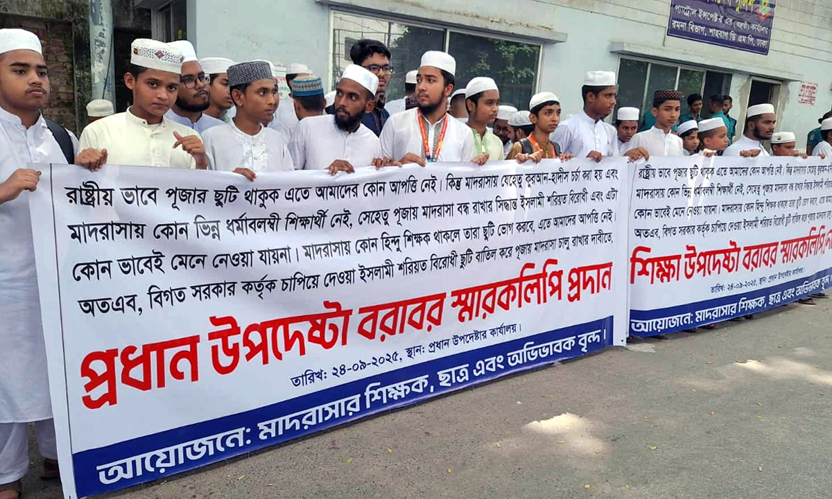 বুধবার (২৪ সেপ্টেম্বর) প্রধান উপদেষ্টা ড. মুহাম্মদ ইউনূসের কার্যালয়ে জমা দেওয়া এক আবেদনে মাদরাসায় দুর্গাপূজার সরকারি ছুটি বাতিলের দাবি জানান তারা।