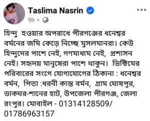 “হিন্দু হওয়ার অপরাধে পীরগঞ্জের ধনেশ্বর বর্মনের জমি কেড়ে নিচ্ছে মুসলমানরা। কেউ হিন্দুদের পাশে নেই, গণমাধ্যম নেই, প্রশাসন নেই। সহৃদয় মানুষেরা পাশে থাকুন”।