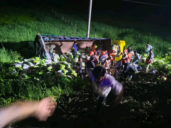 পুলিশ ঘটনা সম্পর্কে জানায়, দিনাজপুর থেকে নোয়াখালীগামী চালবোঝাই একটি ট্রাক হঠাৎ নিয়ন্ত্রণ হারিয়ে মহাসড়কের পাশের খাদে পড়ে যায়। ট্রাকটিতে যারা ছিলেন তাঁরা সবাই ধান কাটার শ্রমিক। ঘটনাস্থলেই সাতজন মারা যান।