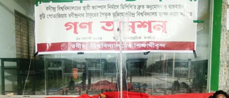 একজন আন্দোলনকারী শিক্ষার্থী বলেন, “আমাদের একটাই কথা রবীন্দ্র বিশ্ববিদ্যালয়ের স্থায়ী ক্যাম্পাস এবং আগামীকালই তার অনুমোদন চাই।”