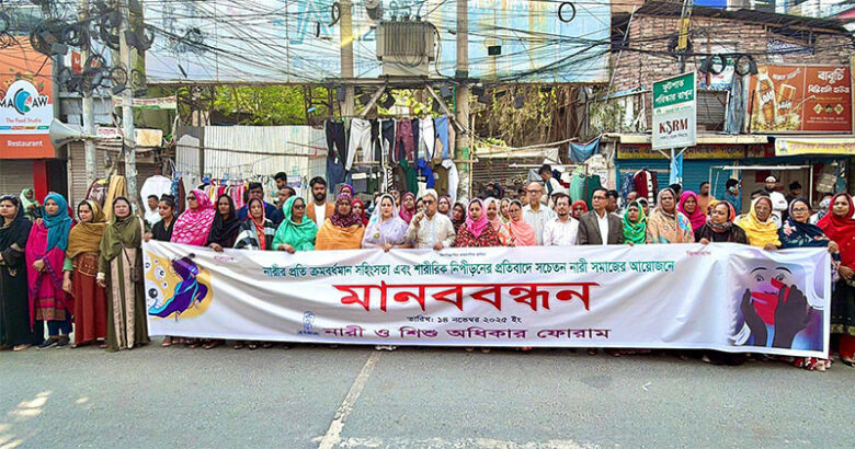 সচেতন নারী সমাজের আয়োজনে এই মানববন্ধনে বিভিন্ন রাজনৈতিক ও সামাজিক সংগঠনের নেতৃবৃন্দ অংশগ্রহণ করেন।