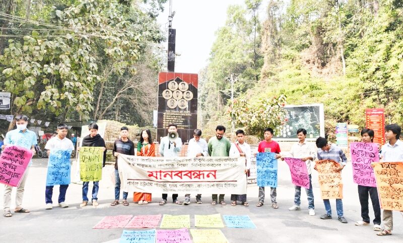 Posted inবাংলাদেশ আদিবাসীদের নিজস্ব মাতৃভাষায় প্রাথমিক শিক্ষা চালুর দাবিতে চট্টগ্রাম বিশ্ববিদ্যালয়ে মানববন্ধন কর্মসূচি পালিত by সোনার বাংলা24 February 21, 2026