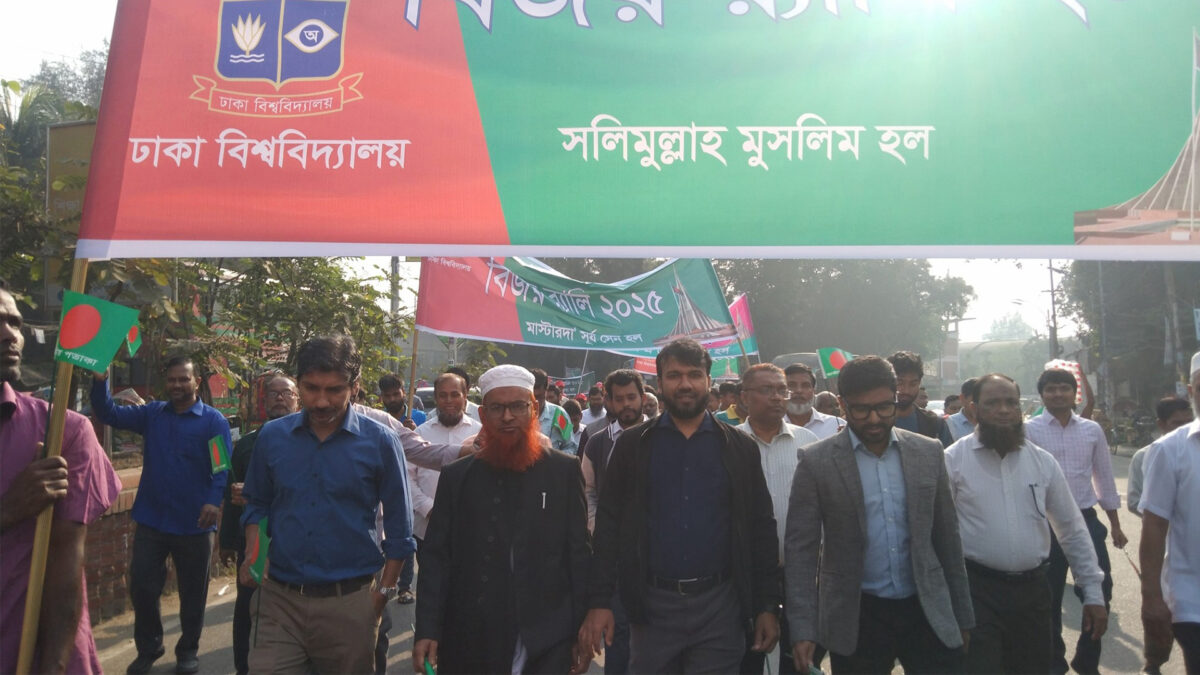 দেখা গেলো, বিজয়ের এই মাসকে ধারণ করতে বিজয় র্যালির আয়োজন করেছে ঢাকা বিশ্ববিদ্যালয়।