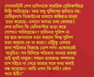 লিখেছেন, সেনাবাহিনী শেখ হাসিনাকে সামরিক হেলিকপ্টারে দিল্লি পাঠিয়েছে। আর শুধু পুলিশের গুলিতে নয়, মেটিকুলাস ডিজাইনের মাধ্যমে জঙ্গিরাও মানুষ হত্যা করেছে। এখানে অসত্য তথ্য কোথায়? শেখ হাসিনা কি হেলিকপ্টার ভাড়া করে গোপনে পালিয়েছেন?