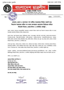 বাংলাদেশ ছাত্রলীগের জেলা-মহানগর-বিশ্ববিদ্যালয়-উপজেলা-পৌর-কলেজ-হল-ওয়ার্ড-ইউনিয়নসহ সকল পর্যায়ের সাংগঠনিক ইউনিটসমূহে লিফলেট বিতরণ, দেয়াল-লিখন, পোস্টারিং কর্মসূচিসমূহ জরুরি ভিত্তিতে বাস্তবায়ন করার জন্য নির্দেশনা দেয়া হল’।